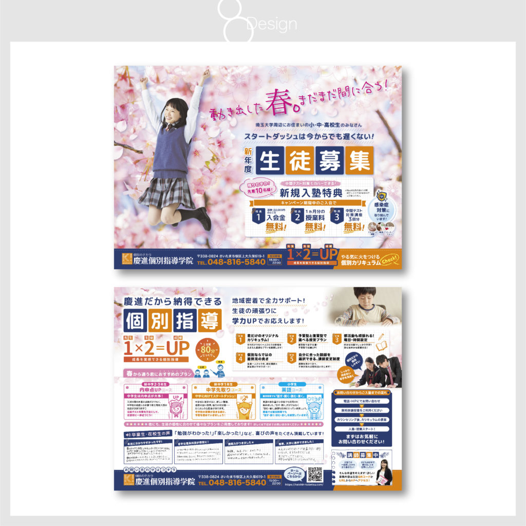〝繋げる〟広告デザイン スクロールダウン チラシから冊子、会社のオリジナル封筒や看板デザインなど、様々な媒体でお作りでいたします。下記に記載の無いものでも、お求めのデザイン案件がございましたら、とりあえず「こんなの作れる?」と聞いてみてください。可能な限り、ご対応させて頂きます。 チラシ ポスター 冊子 DM 名刺 封筒 POP ロゴ イラスト 詳しく 塾 A4チラシ カフェ 看板 工務店 会社案内 エステ A4POP 工務店 収納アイデアPOP 工務店 オリジナル封筒 もっと見る